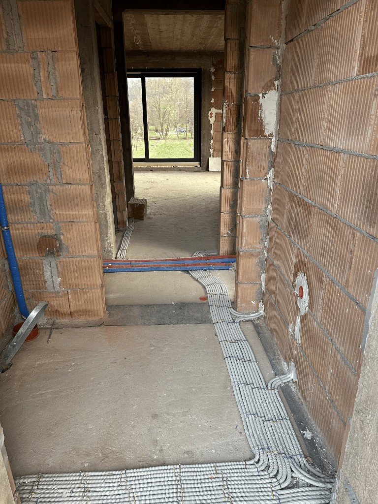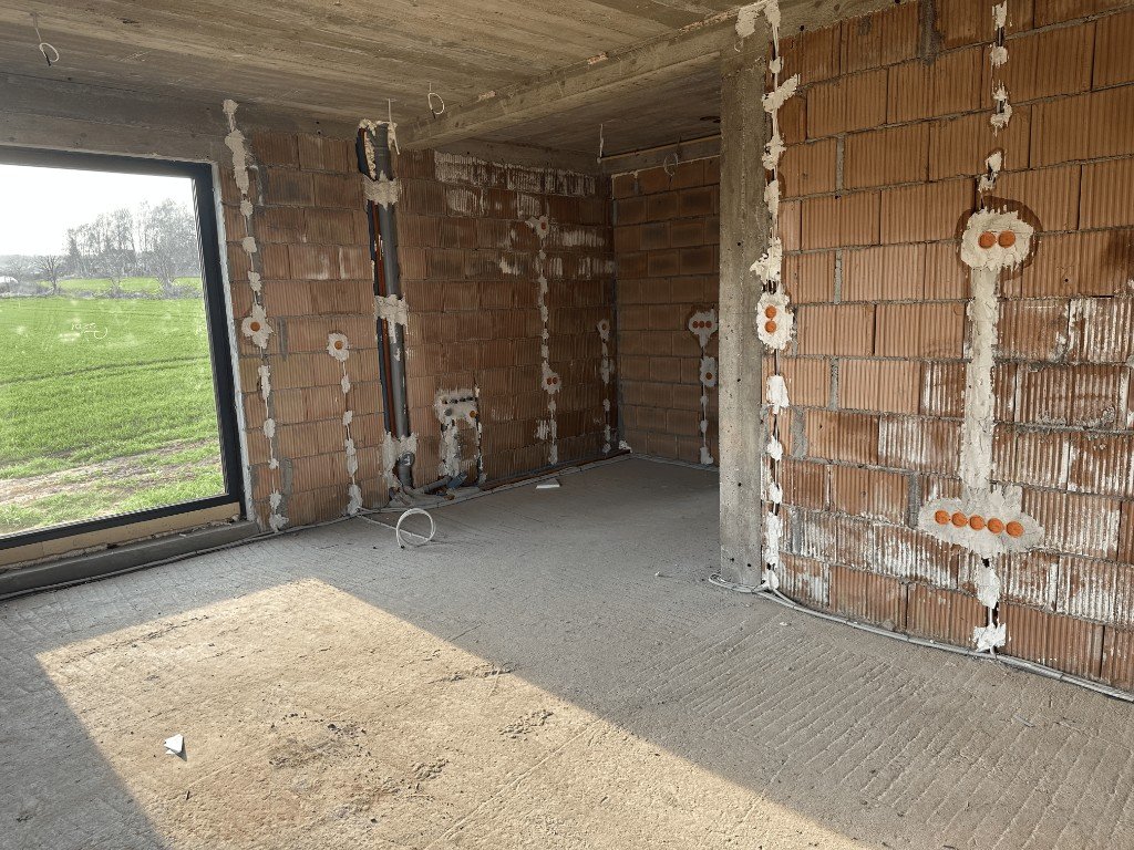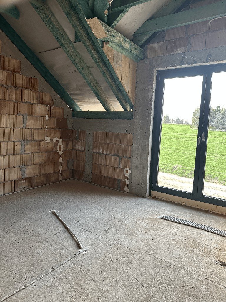 Zdjęcia aktualnego stanu prac na budowie: widoki zewnętrzne i wnętrza w stanie surowym.