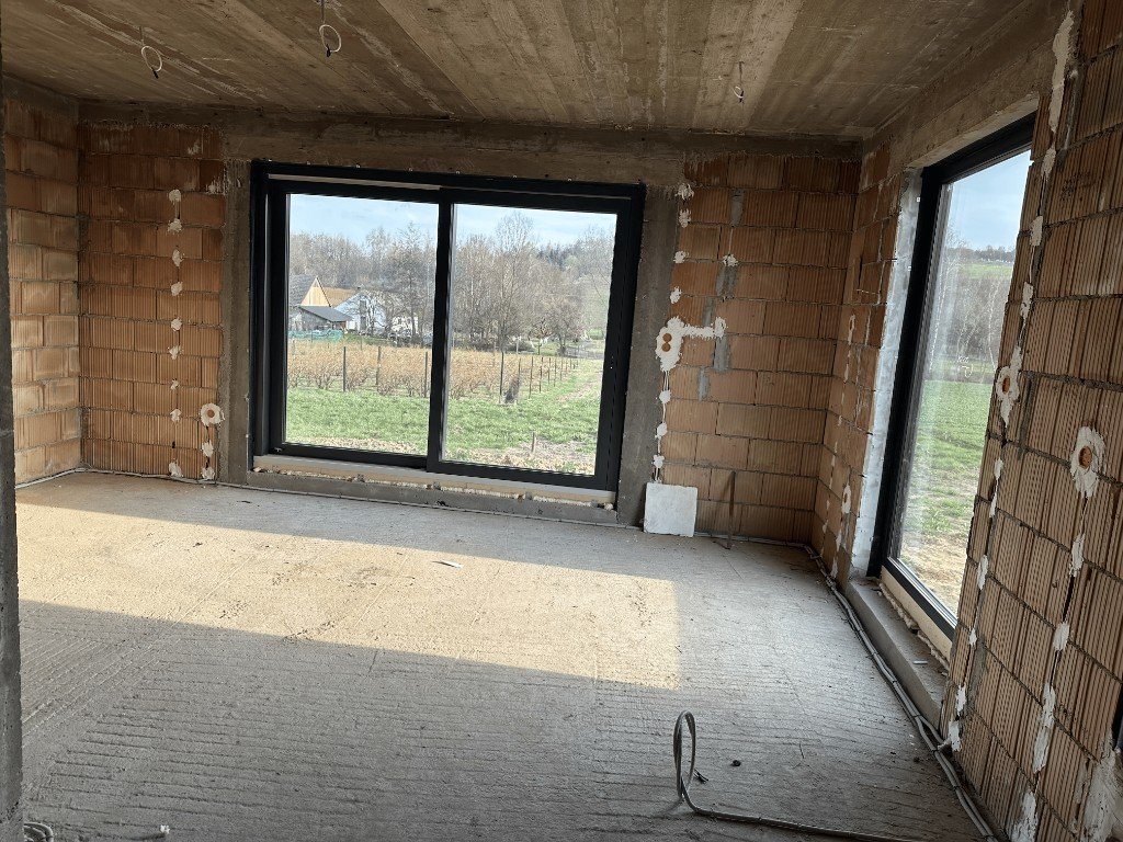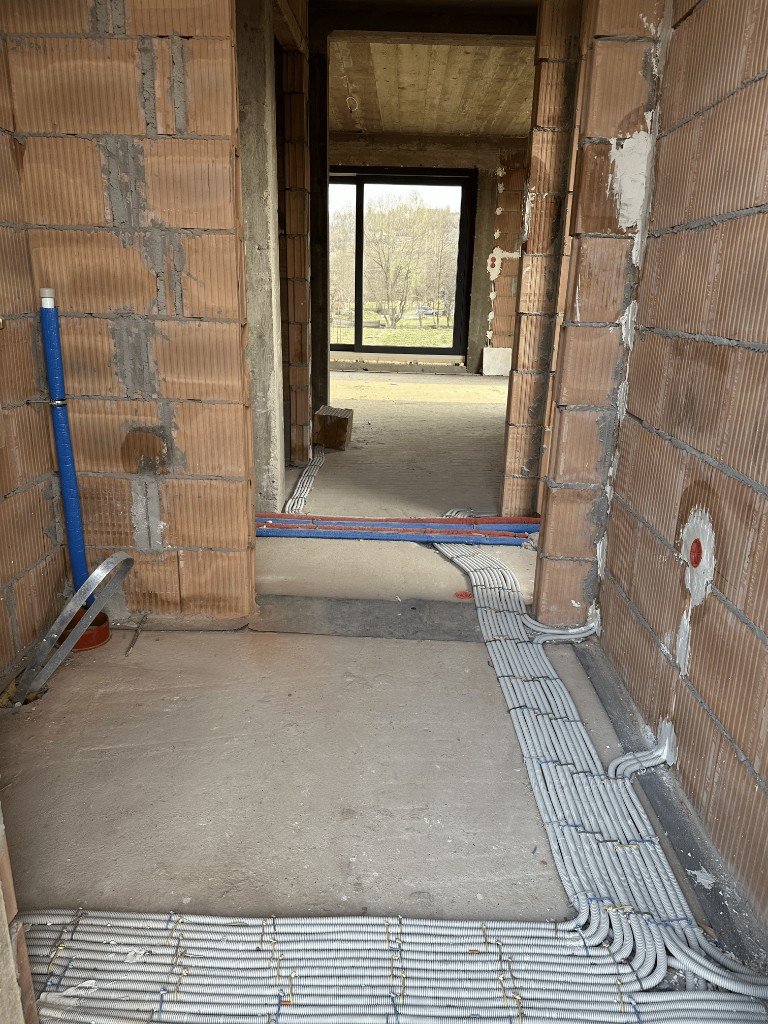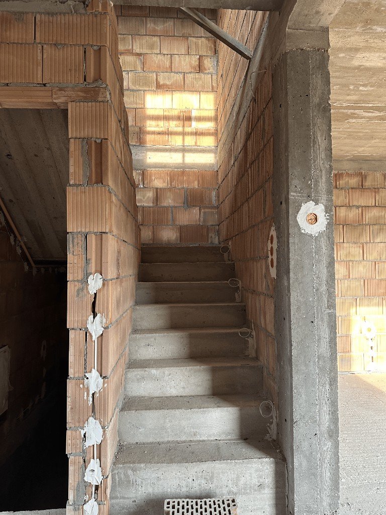 Zdjęcia aktualnego stanu prac na budowie: widoki zewnętrzne i wnętrza w stanie surowym.
